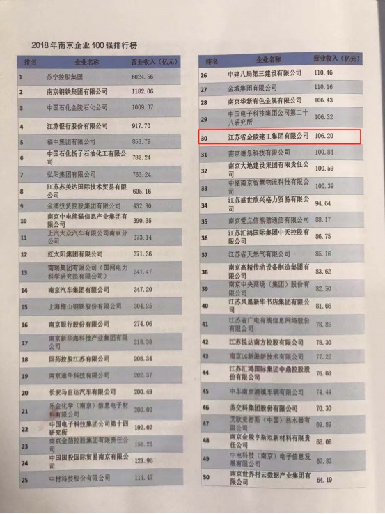 •  2019年12月20日,南京市企業聯合會、南京市企業家協會公布“2018年南京市企業100強”榜單,集團公司入選榜單,位居第30名。